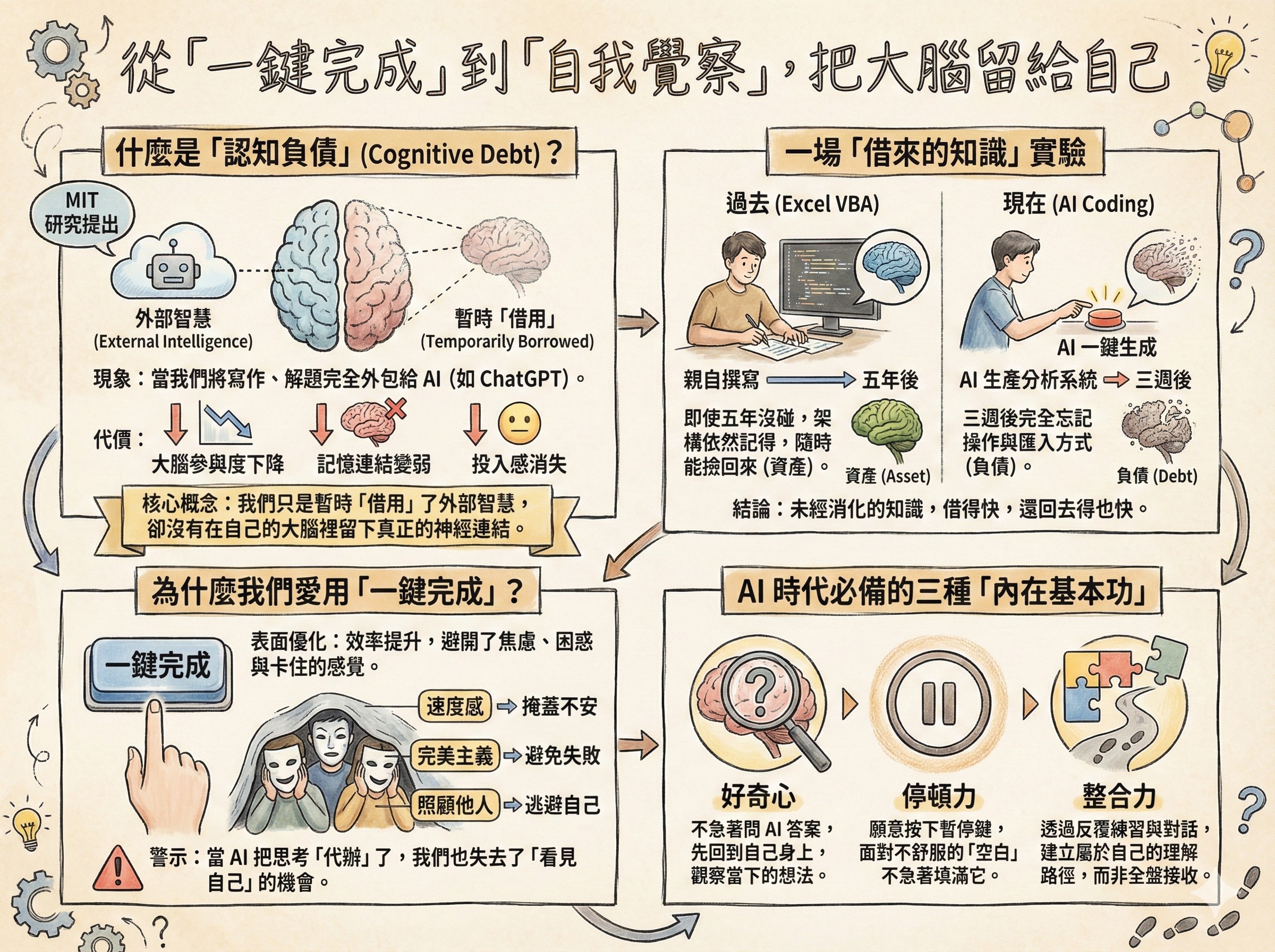 “MIT 研究發現長期使用 ChatGPT 會產生「認知負債」。本文從親身經驗出發,探討在 AI 時代如何透過自我覺察、保持好奇心與停頓力,把學習的主導權留在自己手上,建立真正可帶走的內在能力。”