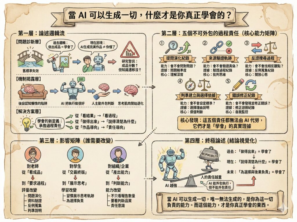 當你說「這是我的作品」、「這是我的決策」、「這是我的報告」,你必須能夠回答:我為什麼這樣做?我用什麼標準判斷這樣是對的?我驗證過哪些資訊?排除過哪些可能性?